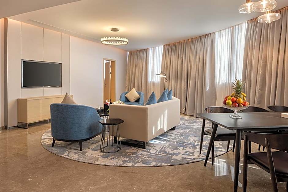 Seasonal outdoor pool with an infinity edge and a shallow end offers a chic, relaxing retreat. An adults-only setting provides a quiet spot to unwind after days spent on King Salman Rd and exploring Buraydah.